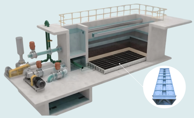 Trong quá trình rửa ngược khí – nước kết hợp, khí và nước được phân phối tách biệt qua các kênh riêng, tạo lực rửa mạnh và đồng đều trên toàn bộ đáy bể. Nhờ đó, hệ thống loại bỏ hiệu quả cặn bẩn, không tạo điểm chết, ngăn vón bùn, đồng thời duy trì tổn thất áp suất thấp và chịu tải lên đến 6 tấn/m².