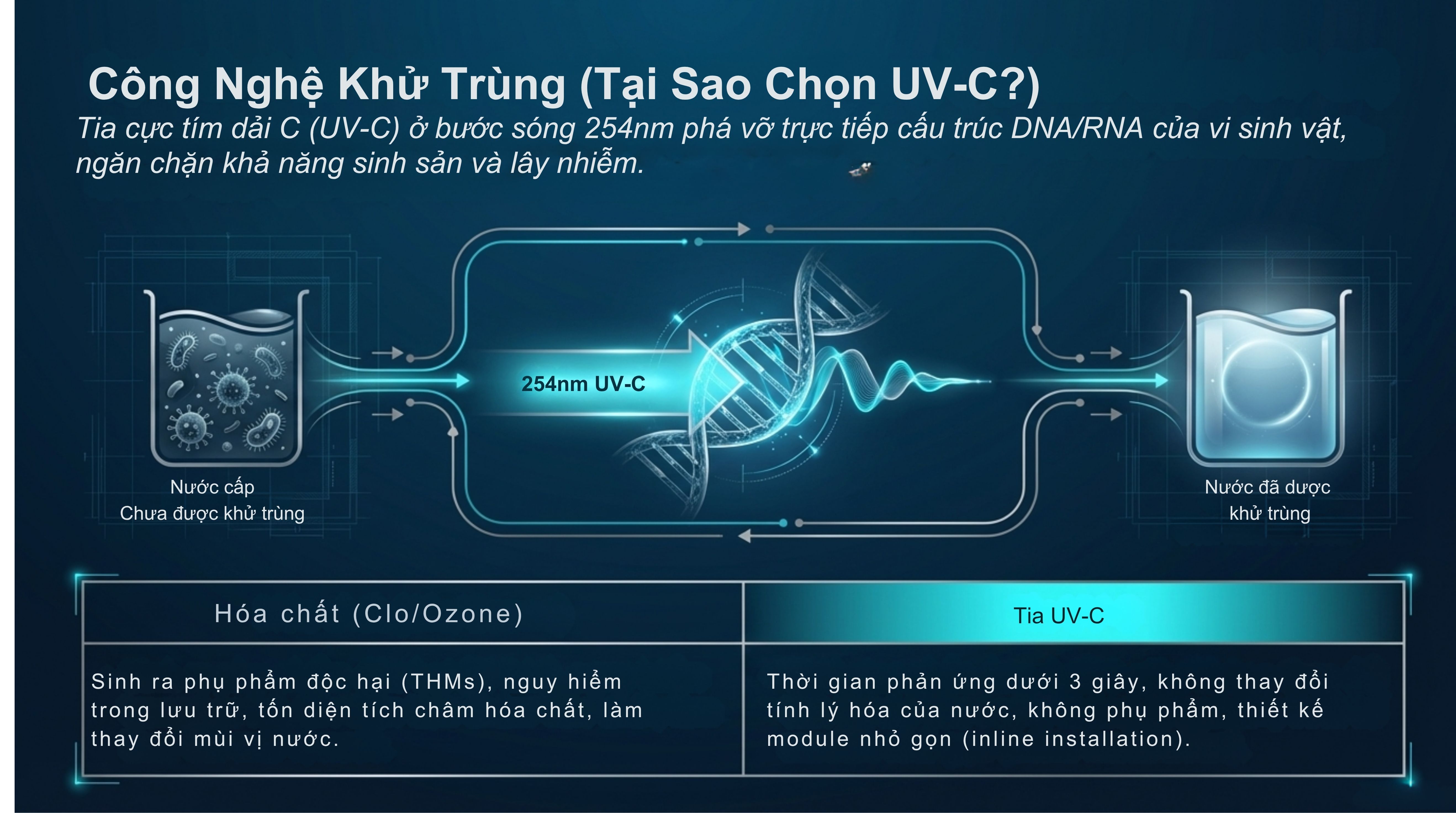 Trong bối cảnh tiêu chuẩn môi trường ngày càng siết chặt, công nghệ UV khử trùng nước đang trở thành lựa chọn hàng đầu thay thế clo truyền thống. UV (tia cực tím) có khả năng tiêu diệt vi sinh vật như vi khuẩn, virus, tảo mà không tạo ra sản phẩm phụ độc hại.