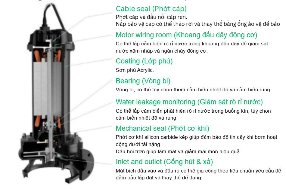 Hydrotech đã tích hợp nhiều công nghệ cơ khí tiên tiến vào dòng bơm chìm này: