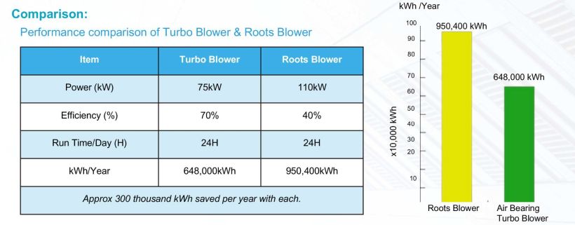 Nhờ vào thiết kế tối ưu và công nghệ vòng bi đệm khí, dòng máy Turbo Blower 75kW của Hydrotech cung cấp hiệu suất vượt trội (70% so với 40%) nhưng lại tiêu thụ ít điện năng hơn hẳn so với một máy Roots Blower 110kW.